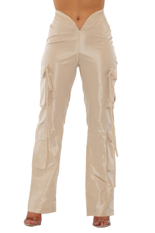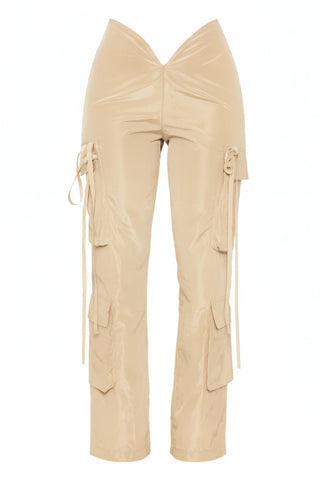 Elevate your streetwear style with these V-Cut Cargo Pants, designed with bold structure and everyday functionality. Featuring a distinctive V-shaped waistline, these pants bring an unexpected edge to the classic cargo silhouette. The wide-leg fit and side cargo pockets provide utility and style. The fabric is non-stretchy yet comfortably structured. Finished with a drawstring waist for an adjustable fit, these pants are perfect for pairing with crop tops, bodysuits, or fitted tees.